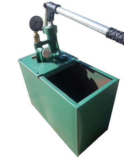1、 打開包裝盒,擰下蓋板下螺栓,取出水箱內(nèi)物件,把蓋板翻180度(缸體向上),閥座底部擰上吸水管,然后用螺栓把蓋板固定在水箱上,按上手柄,即是一臺(tái)完整的手動(dòng)試壓泵。